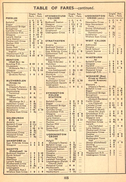 | GLASGOW to | Single | Return | | Alexandria | 1s 11d | 2s 11d | | Ashgill | 1s 11d | 2s 11d | | Balloch | 2/- | 3s 2d | | Bellshill | 1s 2d | 1s 11d | | Biggar | 4s 3d | 6s 6d | | Blackwood | 2s 2½d | 4s 2d | | Blantyre | 1s 0½d | ... | | Bothwell | 1s 1d | 1s 9d | | Bowling | 1s 2d | 2/- | | Braidwood | 2s 4½d | 3s 11d | | Broughton | 4s 11d | 8s 2d | | Burnside via Bridgeton | 7d | ... | | Burnside via Shawfield | 6½d | ... | | Busby | 11d | 1s 7d | | Cambuslang | 7½d | ... | | Cardross | 1s 11½d | 2s 11d | | Carfin | 1s 6d | 2s 5d | | Carluke | 2s 3d | 3s 7d | | Clarkston | 7½d | 1s 2d | | Cleland | 1s 9½d | 2s 8d | | Clydebank | 10d | 1s 6d | | Coalburn | 2s 11d | 4s 11d | | Douglas | 3s 9d | 5s 8d | | Drumelzier | 5s 4d | 8s 9d | | Dumbarton | 1s 6½d | 2s 6d | | Duntocher | 1s 0½d | 1s 11d | | East Kilbride via Burnside | 1s 2d | 2s 2d | | East Kilbride via Busby | 1s 2d | 2s 2d | | Eddlewood Toll | 1s 6d | 2s 4d | | Faifley | 1s 1½d | 2/- | | Hamilton | 1s 3d | 2s 3d | | Harthill | 2s 3d | 3s 11d | | Helensburgh | 2s 4d | 3s 4d | | High Burnside | 8½d | ... | | Holytown | 1s 4d | 2s 3d | | Lanark | 3/- | 4s 4d | | Larkhall | 1s 7½d | 2s 8d | | Lesmahagow | 2s 5d | 4s 6d | | Lyne | 5s 10d | ... | | Mossend | 1s 3d | 1s 11d | | Motherwell | 1s 6d | 2s 3d | | Muirkirk | ... | 6s 6d | | Netherburn | 2s 1d | 3s 7d | | Newarthill | 1s 7½d | 2s 7d | | Newmains | 1s 11d | 2s 11d | | New Stevenston | 1s 4½d | 2s 3d | | Newton | 11½d | 1s 9d | | Old Kilpatrick | 1s 1d | 1s 11d | | Parkhall | 1s 0½d | 1s 9d | | Peebles | 6s 4d | 10s 7d | | Rachan Mill | 5s 2d | 8s 4d | | Renton | 1s 9½d | 2s 10d | | Rutherglen | 5½d | ... | | Salsburgh | 1s 10d | 2s 11d | | Sandford | 2s 2d | 4s 2d | | Sheddens | 10d | 1s 5d | | Shotts | 2s 4d | 3s 11d | | Skirling | 4s 6d | ... | | Stobo Hall | 5s 7d | ... | | Stonehouse | 1s 11½d | 3s 7d | | Strathaven via Uddingston | 2s 3d | 3s 11d | | Strathaven via East Kilbride | 2/- | ... | | Symington | 3s 10d | 6s 6d | | Thankerton | 3s 8d | 6s 4d | | Uddingston | 1s 0½d | 1s 7d | Whitburn | 2s 6d | 4s 4d | | Wishaw | 1s 9½d | 2s 8d |